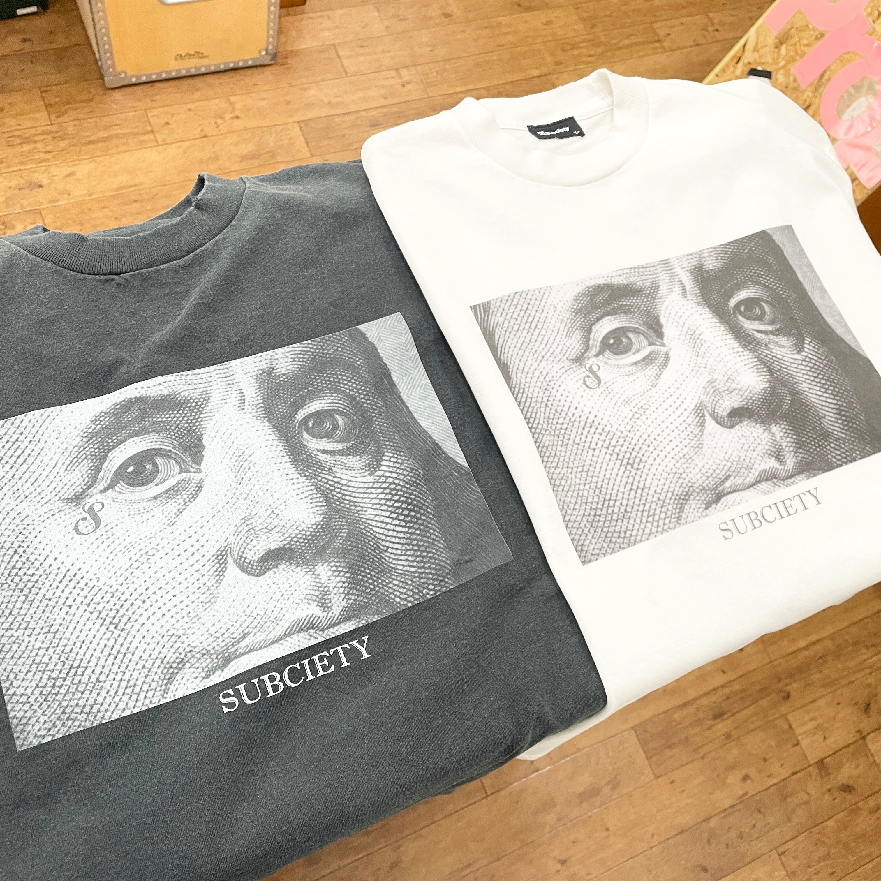 襟部分にはダメージ加工を施し、よりリアルな経年変化をイメージ。フロントにはアメリカ建国の父として知られる「ベンジャミン・フランクリン」を大判プリントで施しました。Subcietyの頭文字「S」の涙を流した遊び心溢れるデザイン。