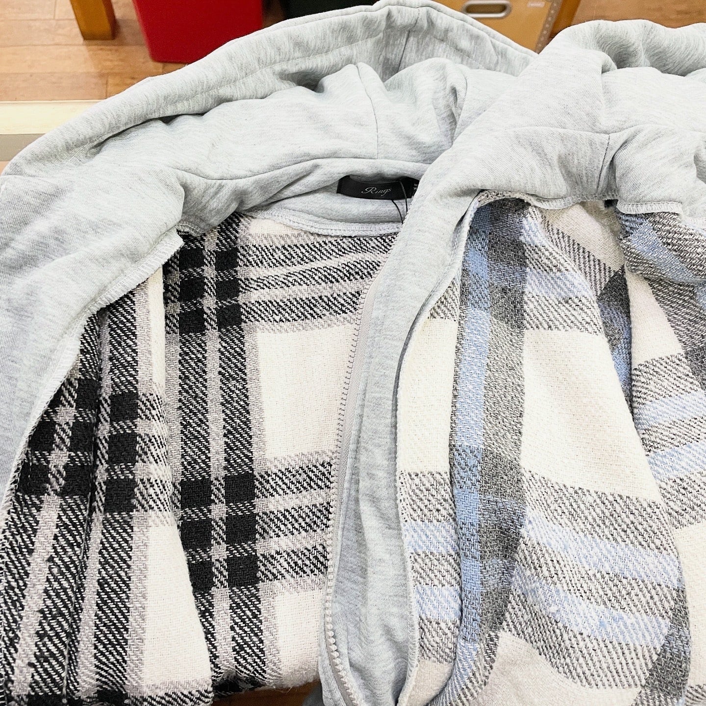 チェック柄シャツにフードをレイヤードしたデザインアウター。
