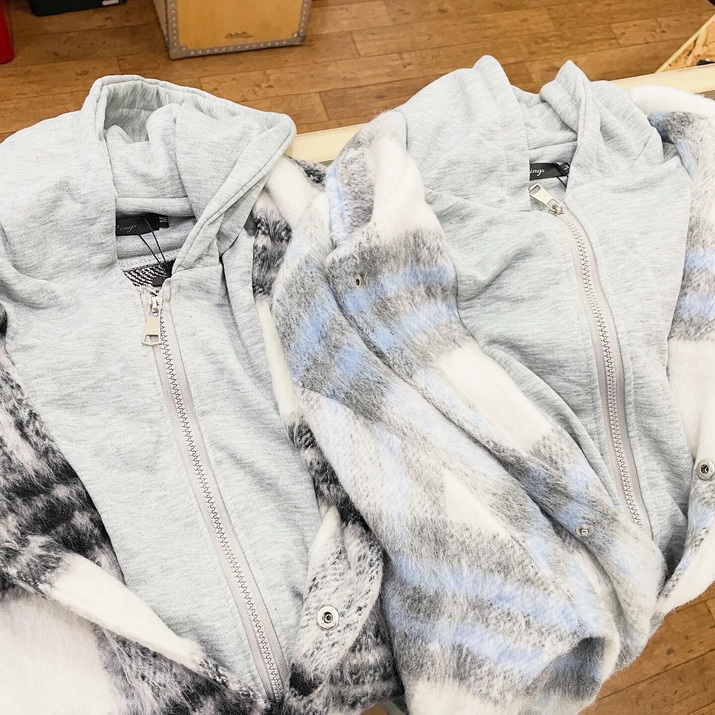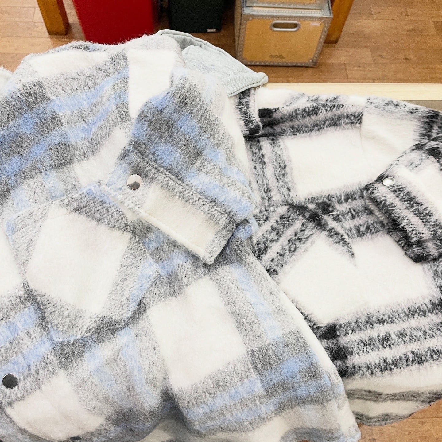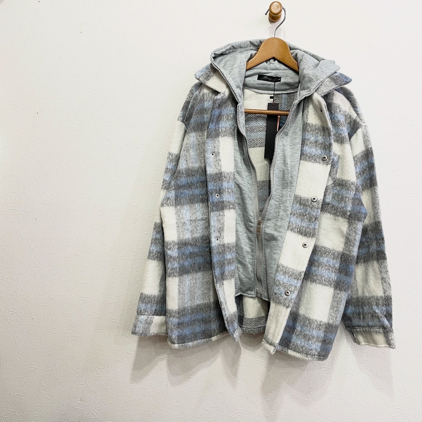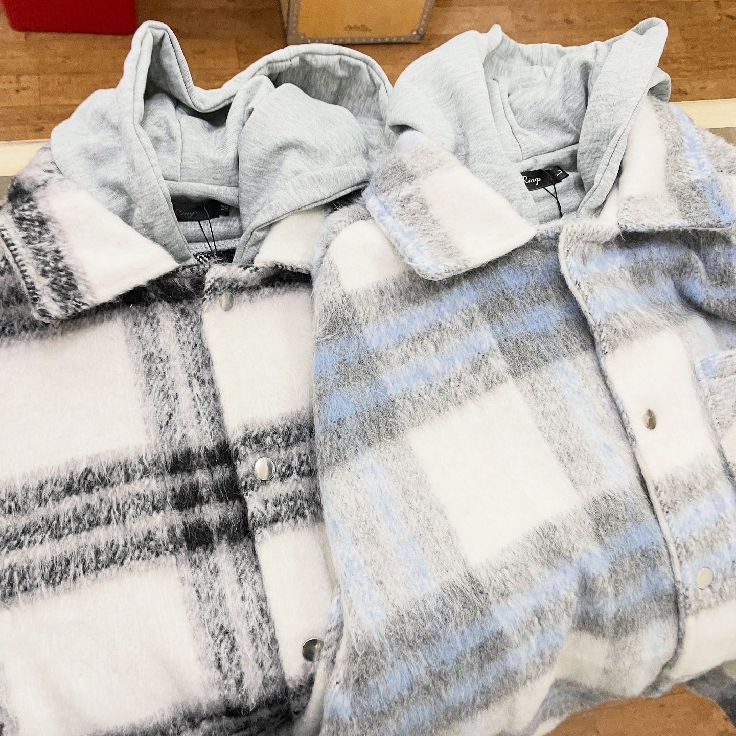 チェック柄シャツにフードをレイヤードしたデザインアウター。