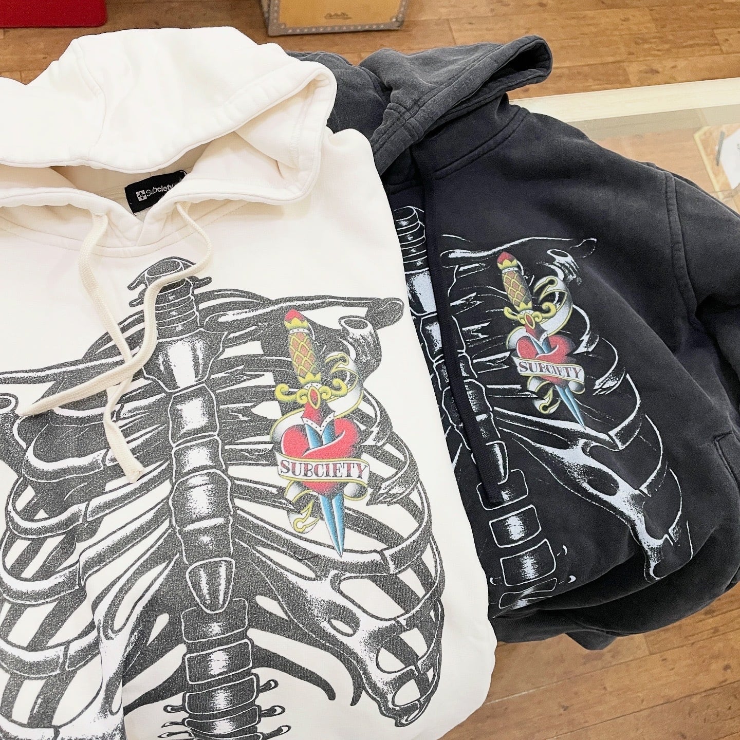 ブラック&グレーのタトゥーテイストで描かれた骸骨にトラディショナルテイストで描かれた心臓をフロント全面にプリント。