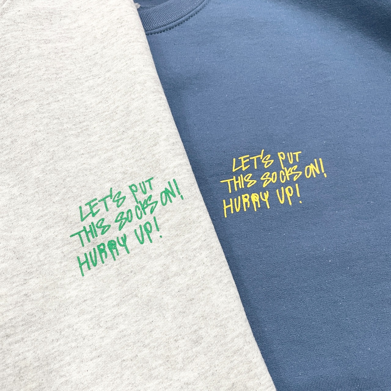 " LET'S PUT THIS SOCKS ON !HURRY UP !" をプリント。