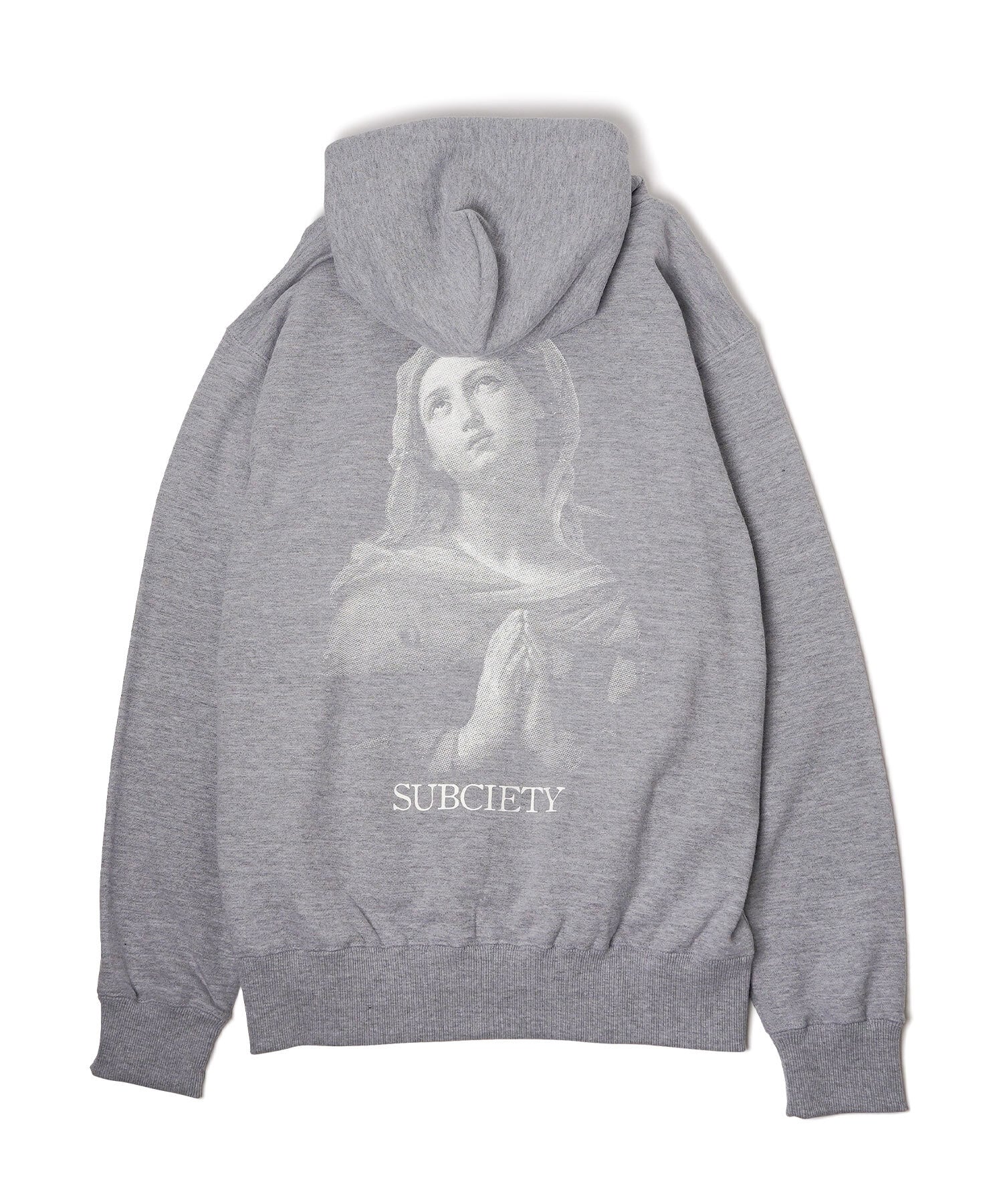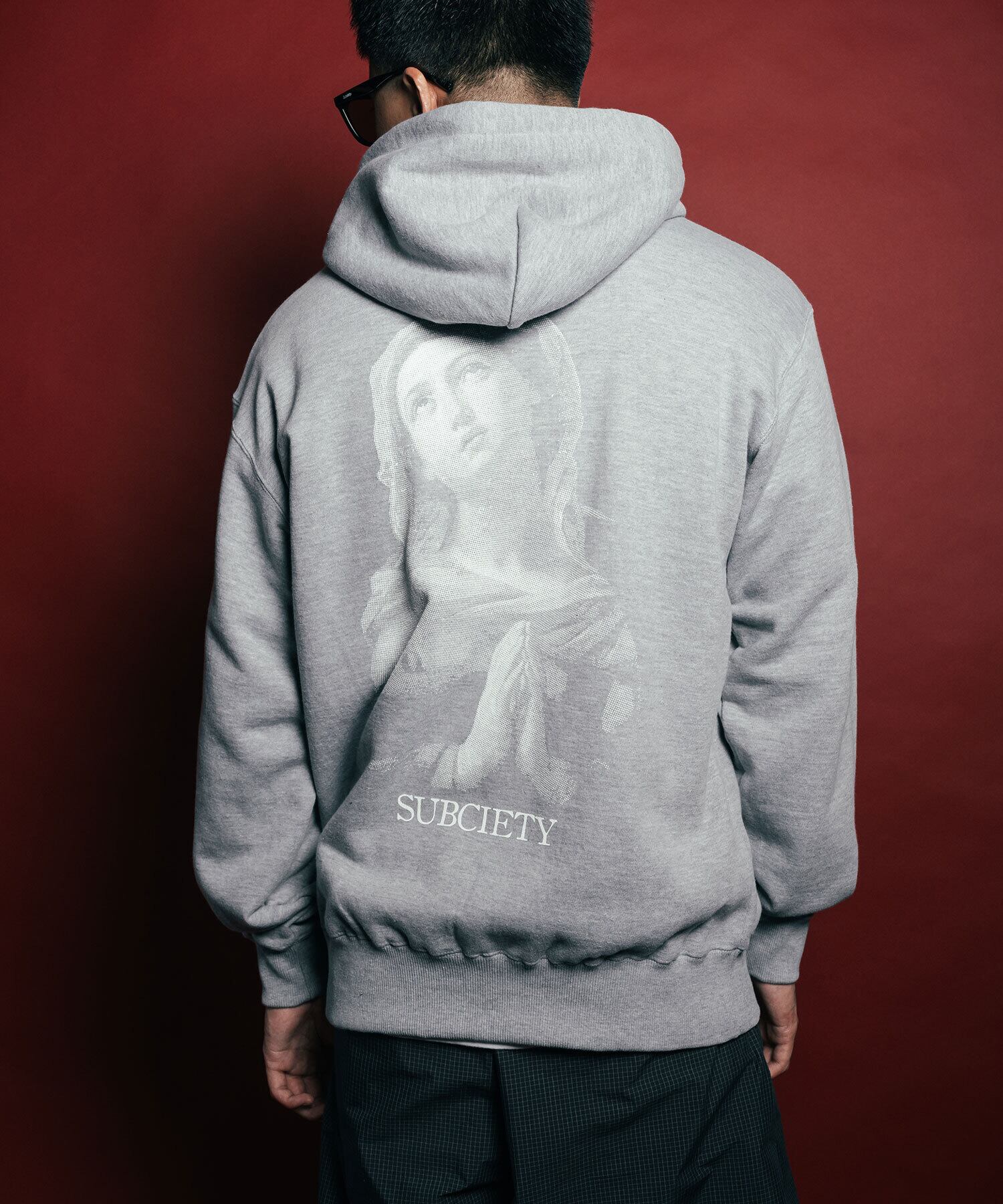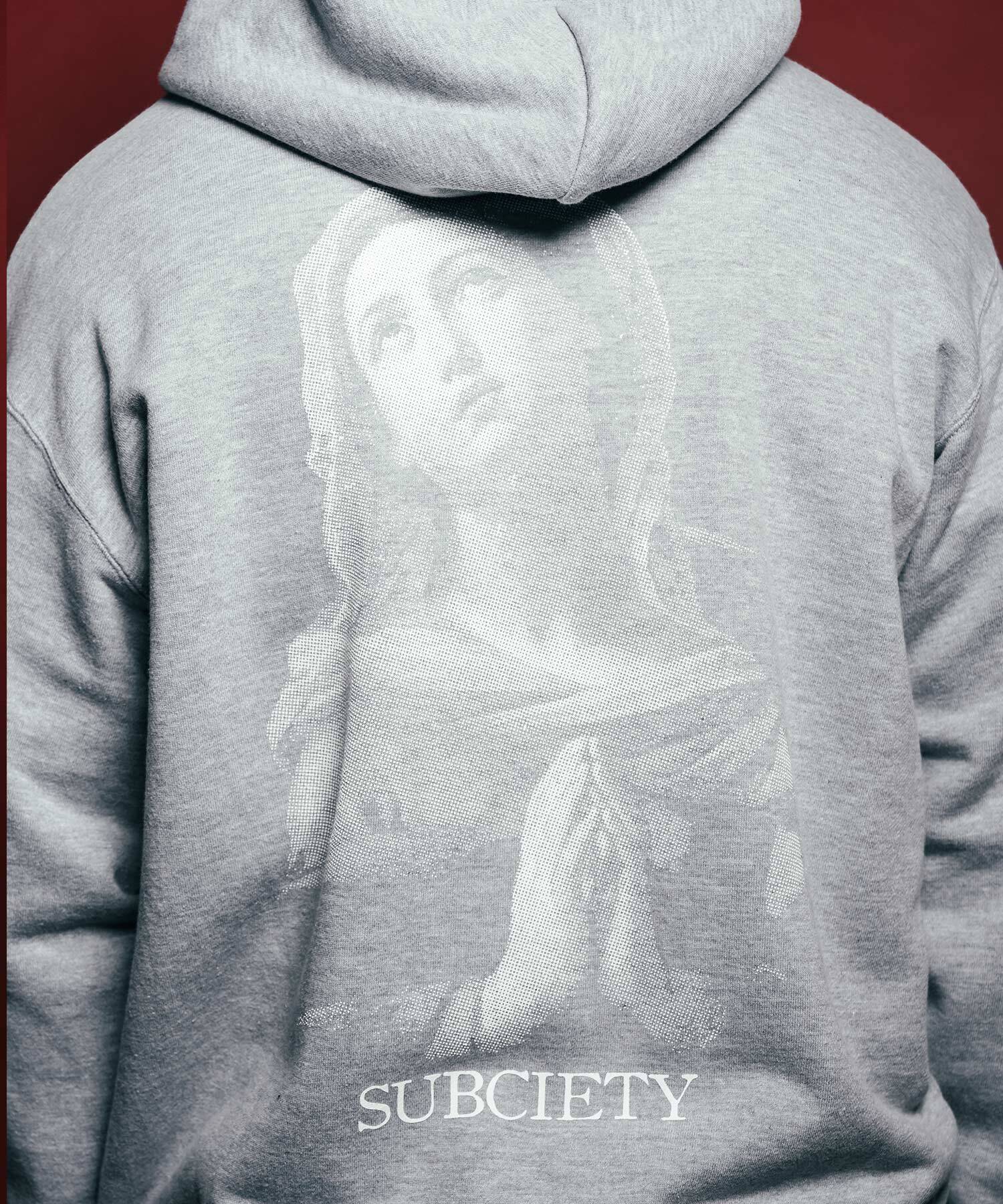 左胸にはブランドロゴ、バックにはグイド・レーニ作の『The Madonna in Prayer』を網点のシルクスクリーンプリントで施しました。