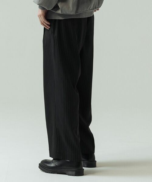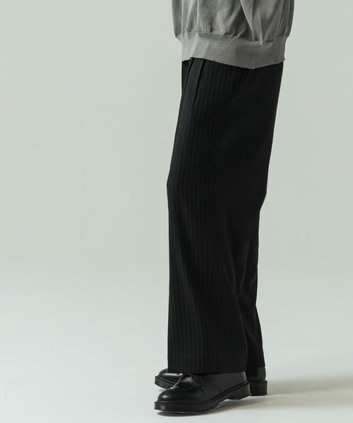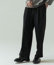 TR素材のピンストライプ生地を使用したワイドパンツ。