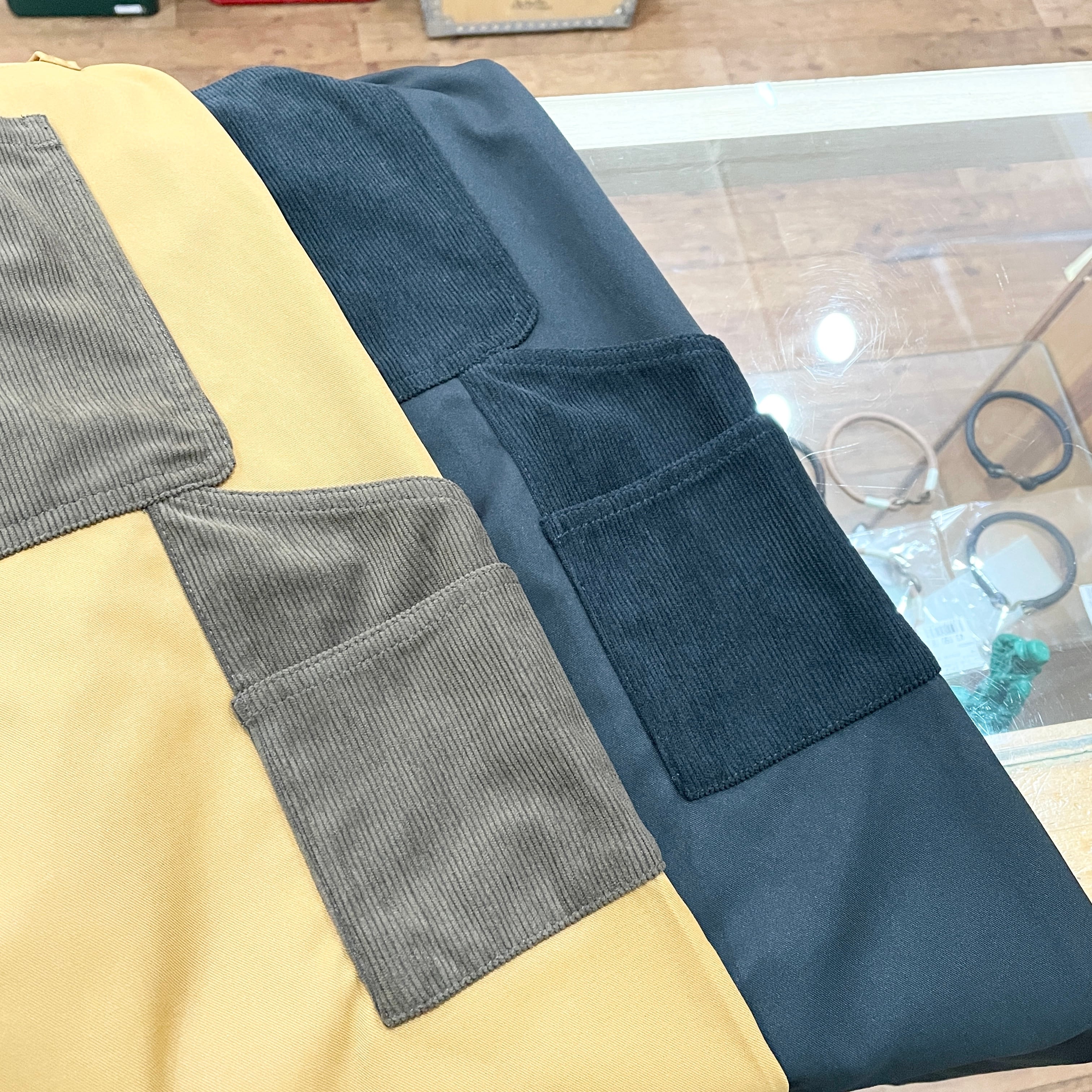 ポケット部分はコーデュロイで切り替え、遊び心のあるデザインに仕上げています。