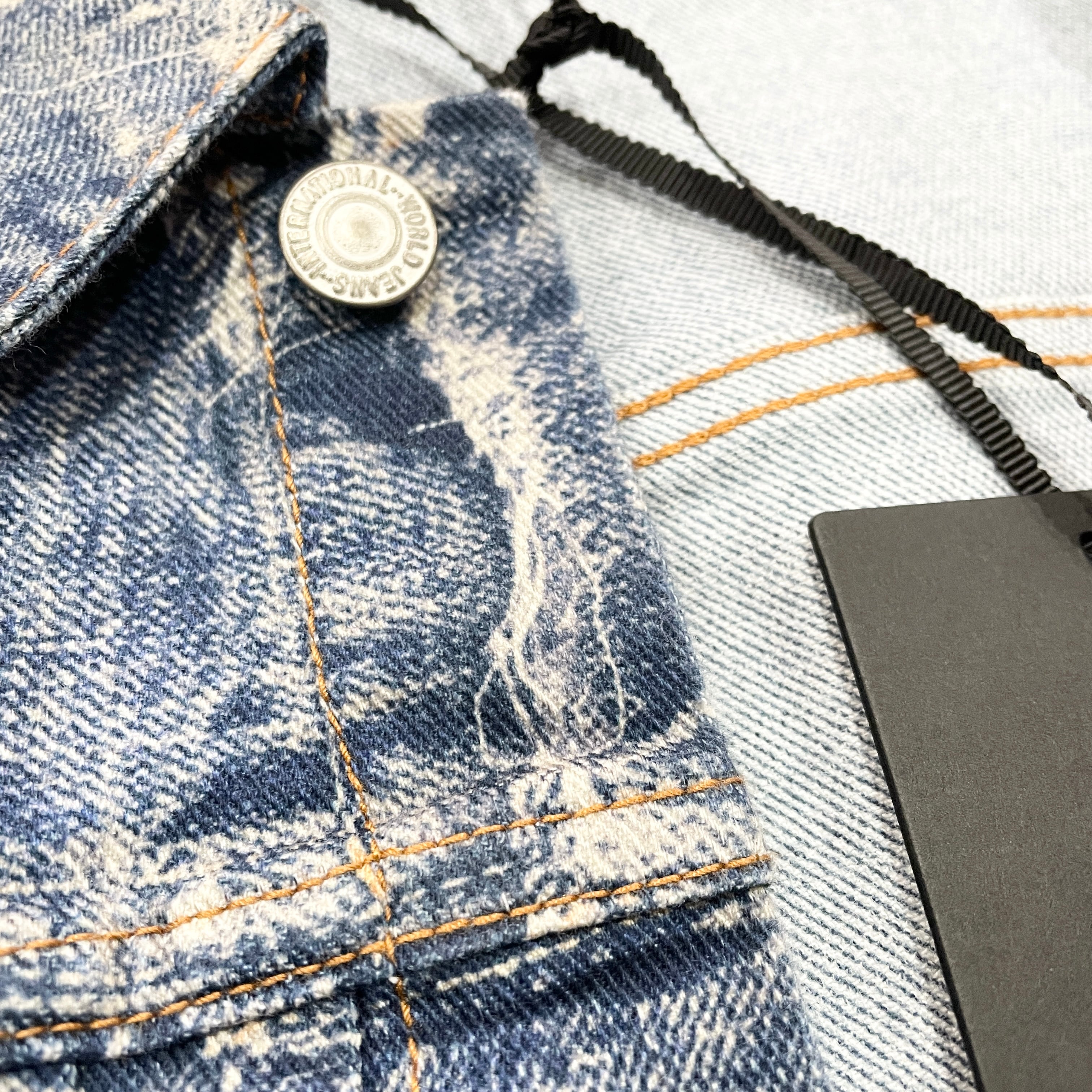 だまし絵(トロンプロイユ)の手法を用い、デニムの色落ちやアタリ、縫製の陰影までをプリントで表現している。
