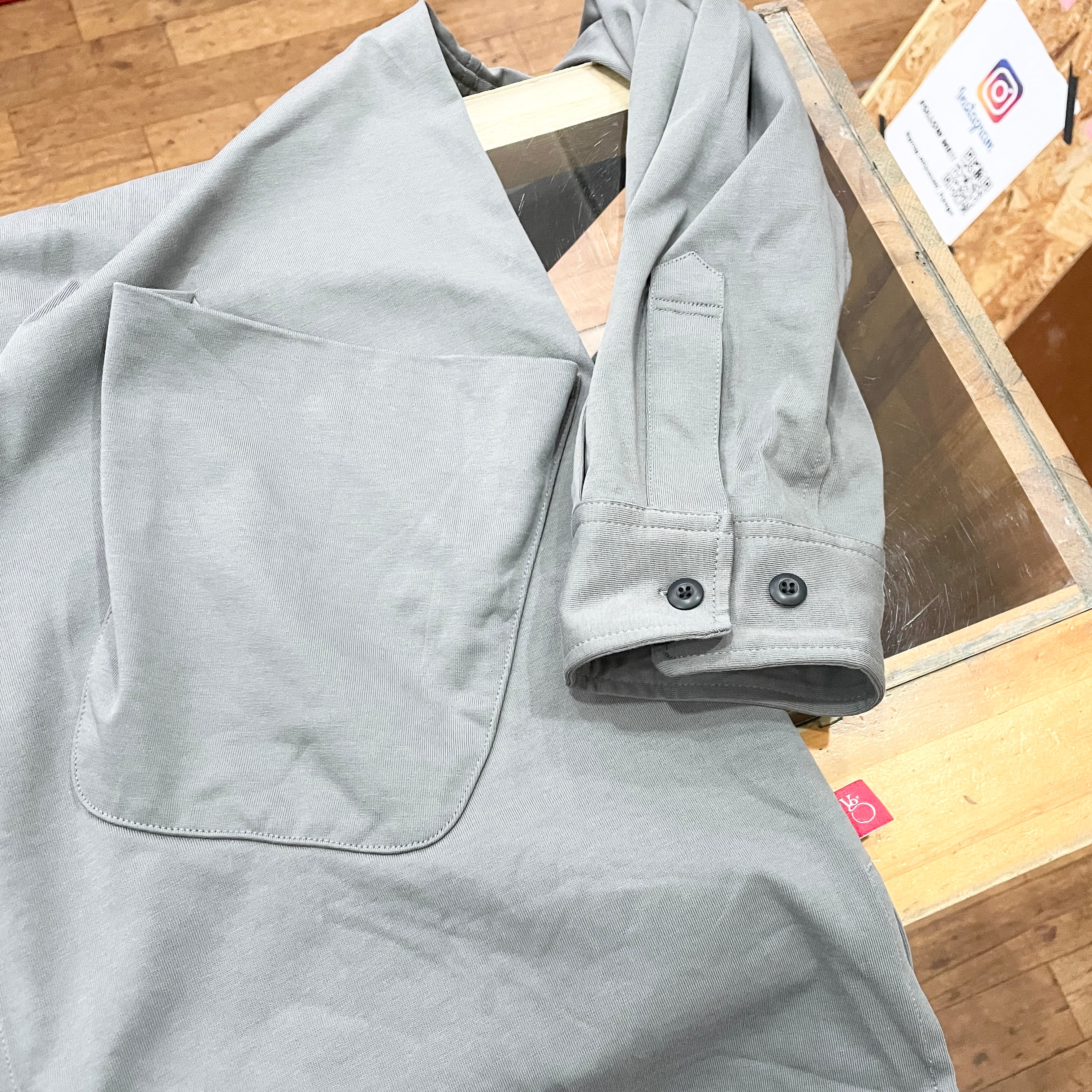 極限までハイゲージで編み込んだ天竺を使用した多機能ノーカラーシャツ。