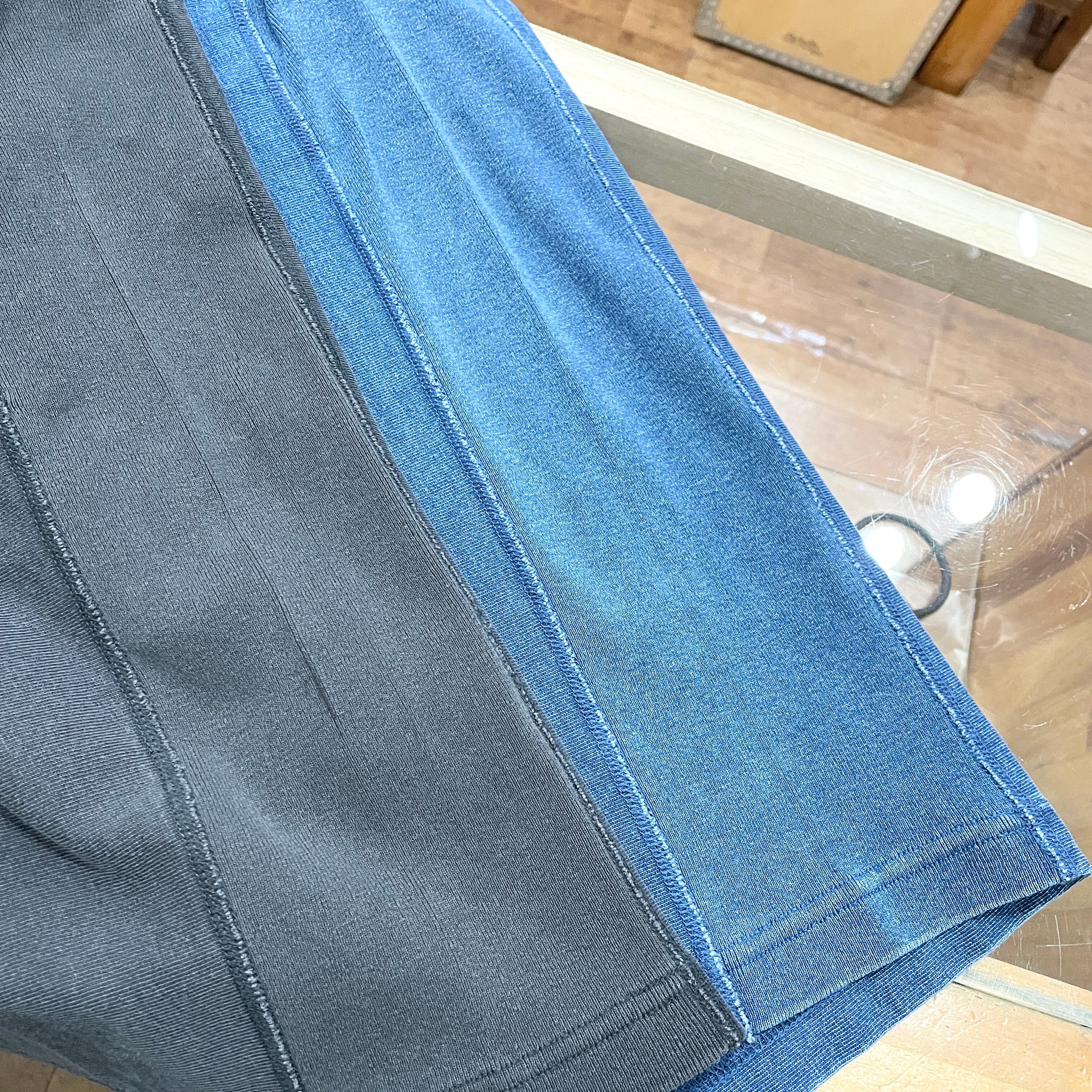 いずれも「ロープ染色」という染色法により糸の芯が白いまま染め残っているので、着用を繰り返すうちに白い部分が少しずつ表に現れるなど、デニムと同じような生地の表情の変化を楽しむことができます。