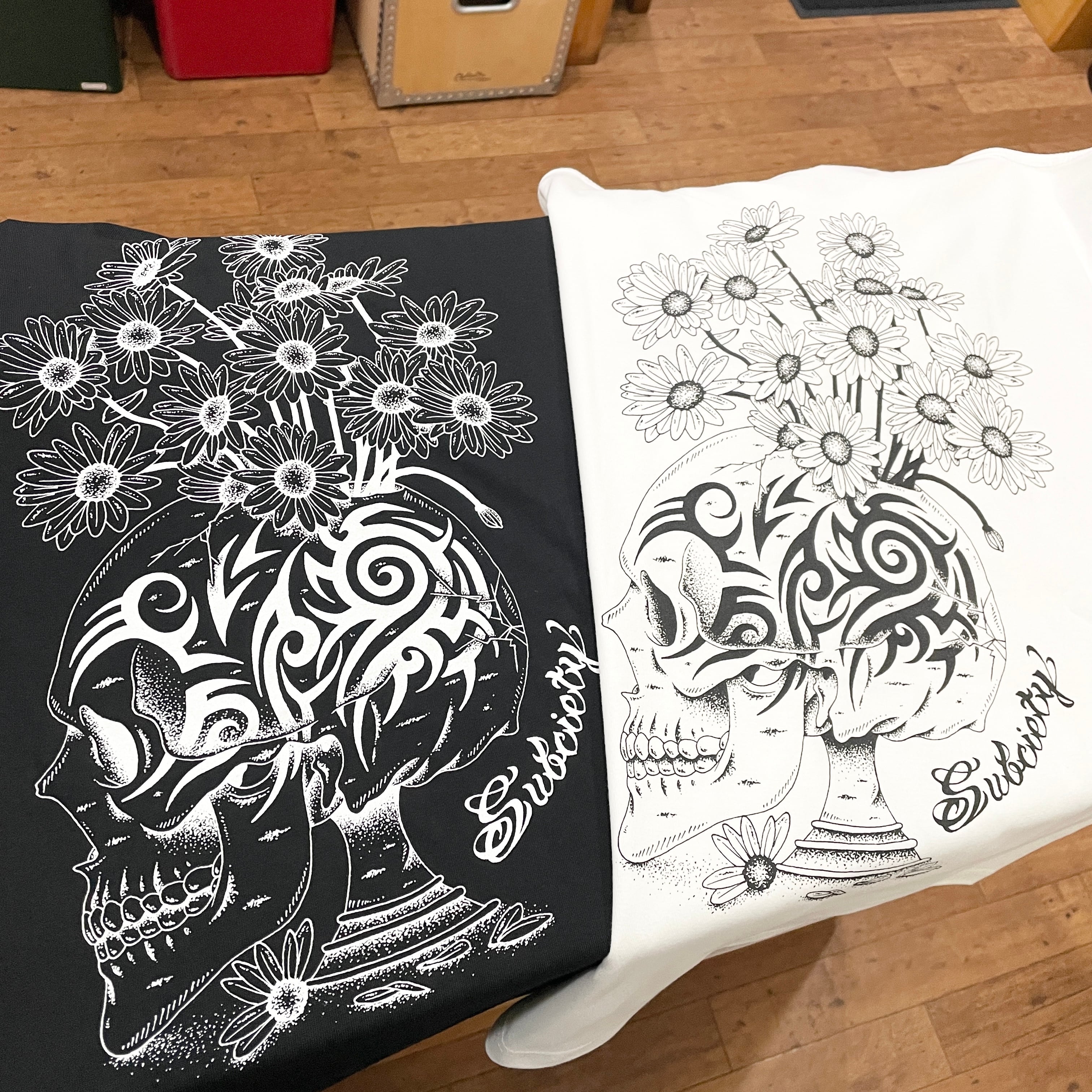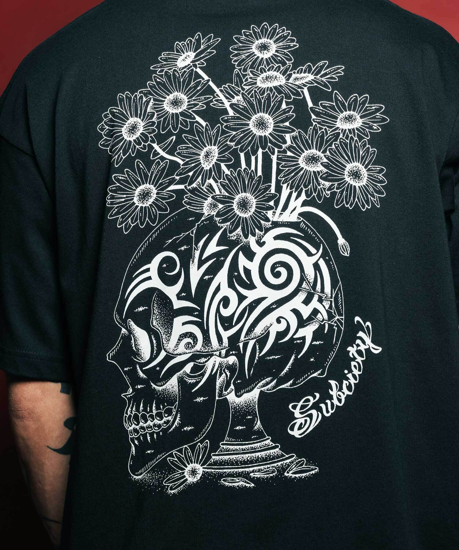 トライバルのタトゥーでブランドらしさを、散った花びらで儚さやもろさを表現したバッグ、左胸共にグラフィックが映えるTシャツ。