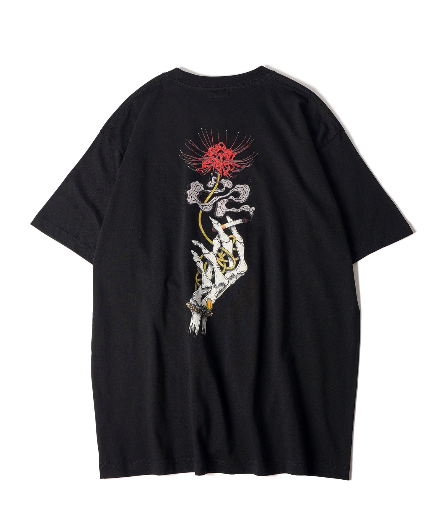 左胸にはブランドロゴを、バックにはスカルハンドと彼岸花をモチーフにしたグラフィックをプリントで施しました。