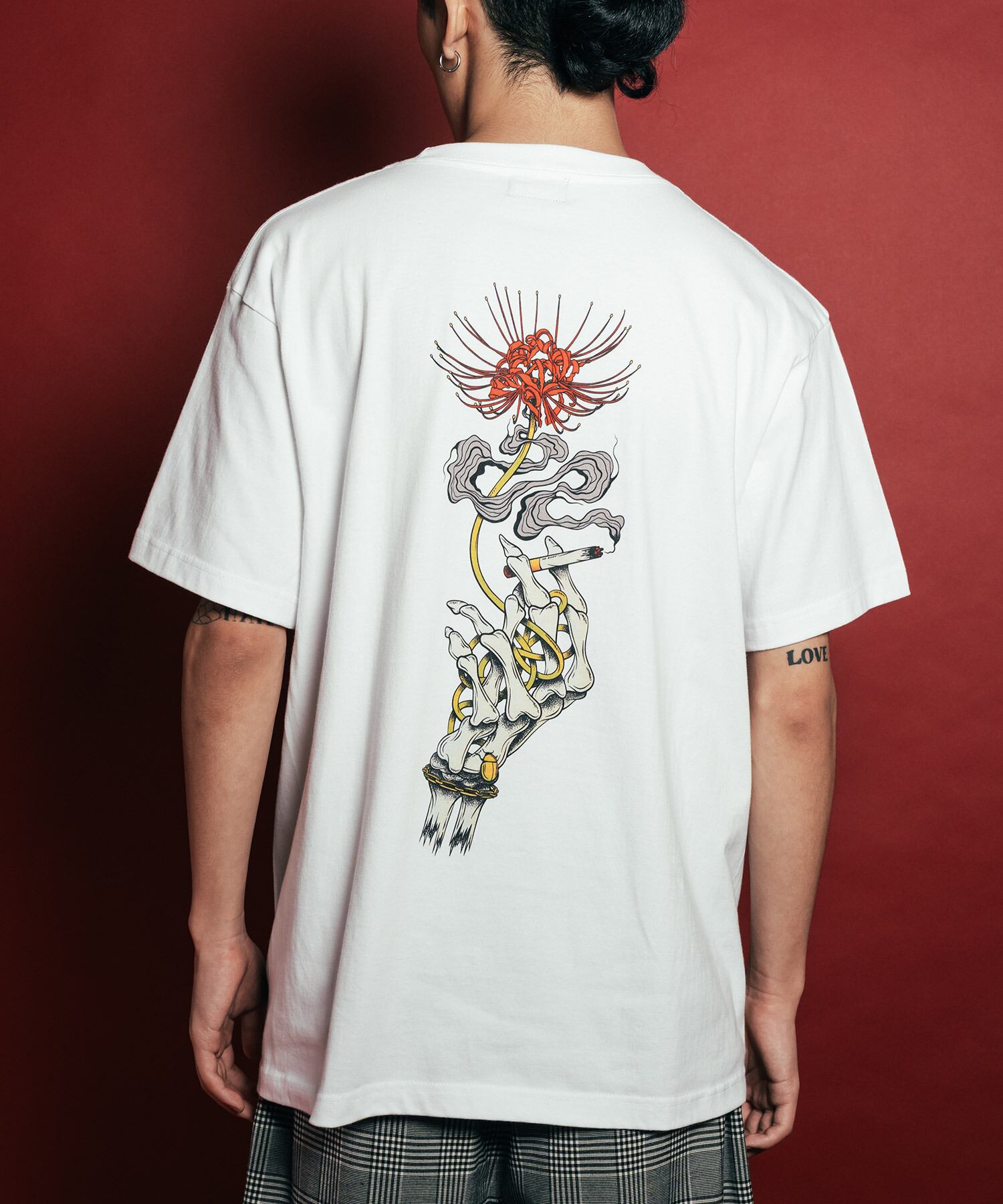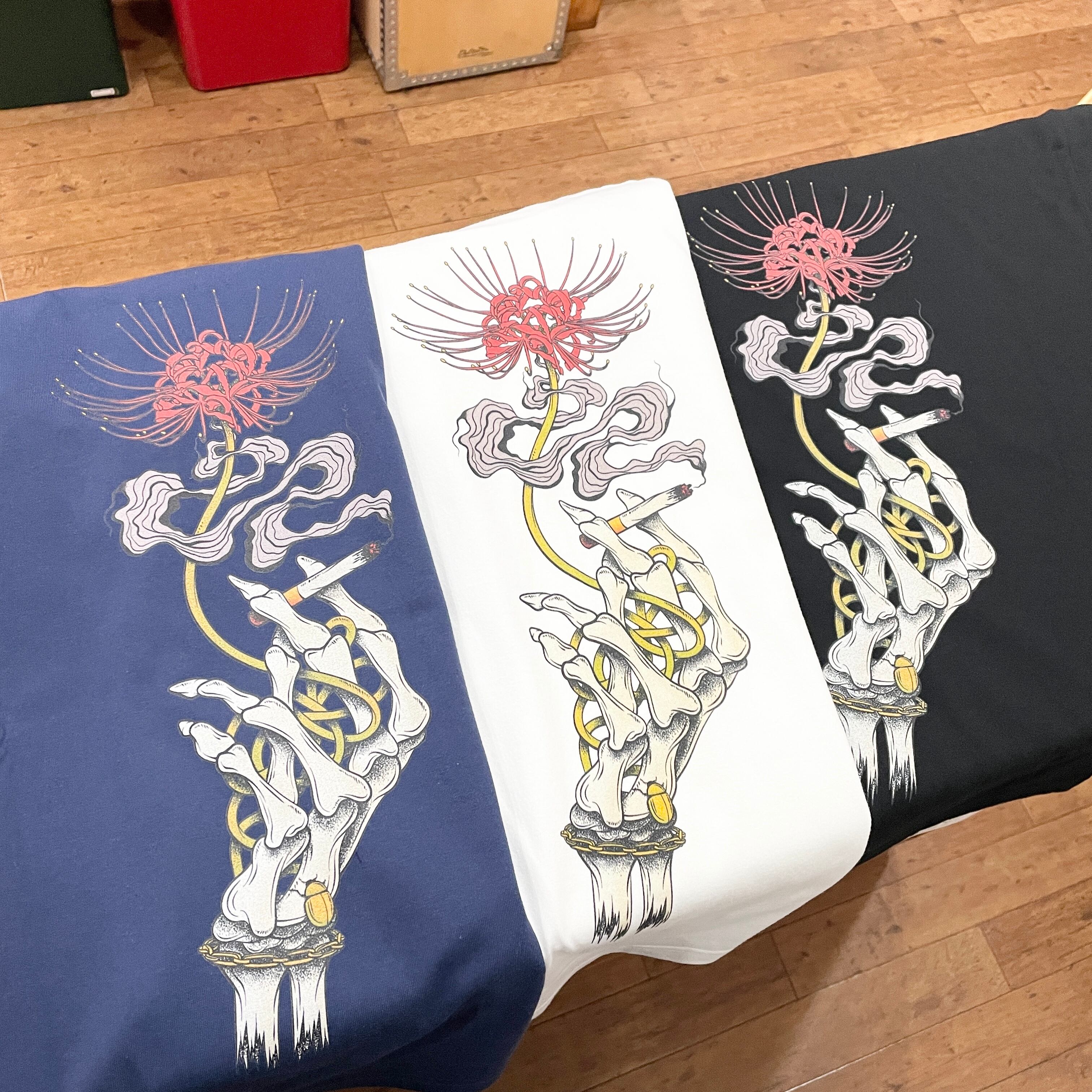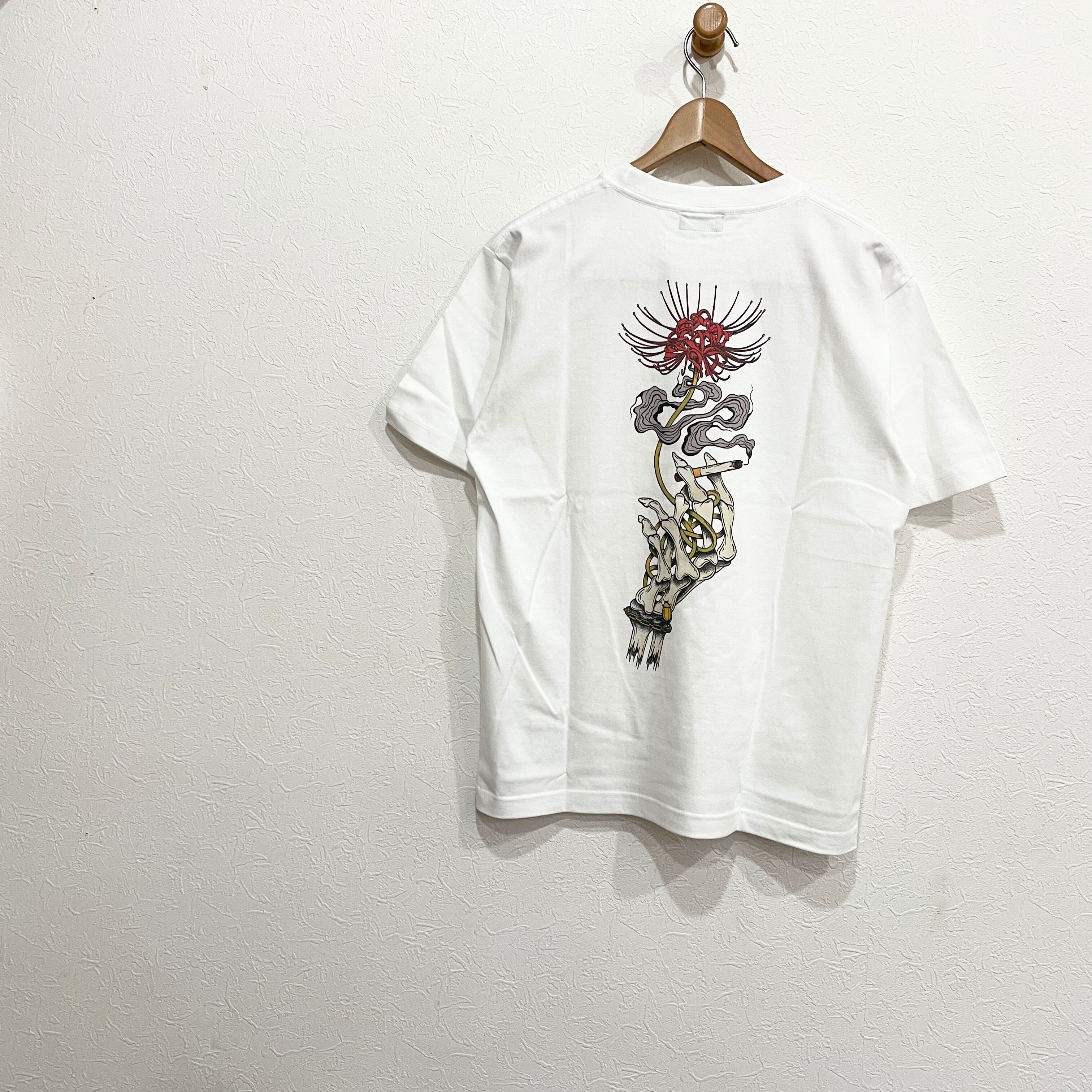 左胸にはブランドロゴを、バックにはスカルハンドと彼岸花をモチーフにしたグラフィックをプリントで施しました。