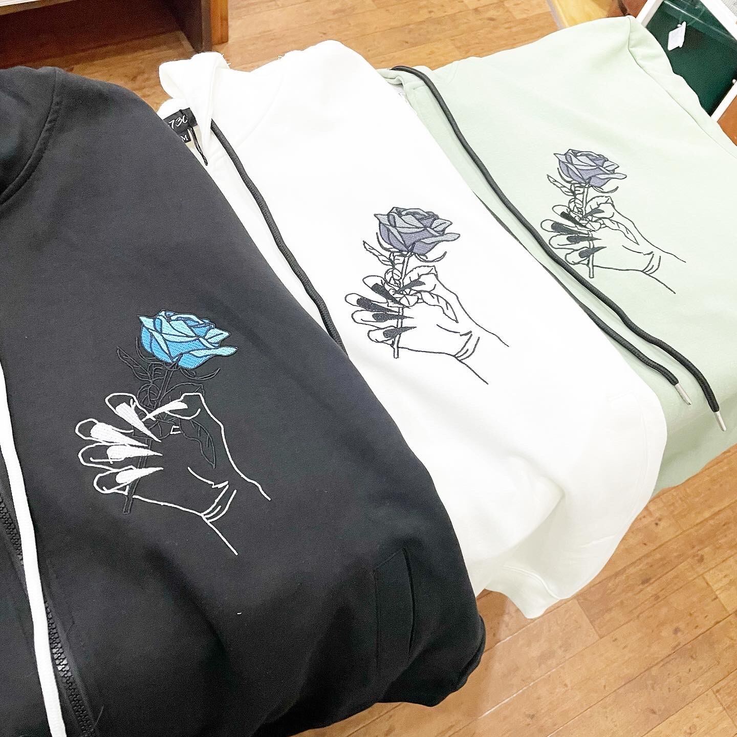 背中に薔薇の刺繍を施したフルジップのパーカー。